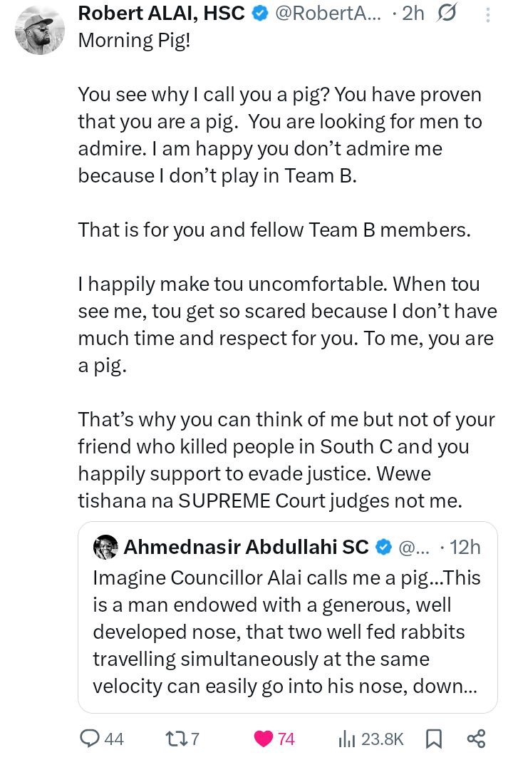 In a post shared online, Robert Alai strongly attacked the senior lawyer using very harsh language. He directly insulted Ahmednasir by calling him a “pig” and went ahead to state that the lawyer could not tell him anything.